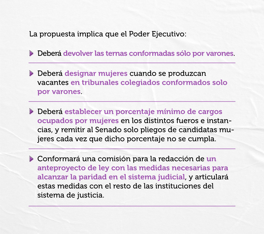 Entre las disposiciones del decreto sugerimos que se incluya la obligación de devolver las ternas remitidas por las instituciones judiciales cuando estén conformadas solamente por varones; la obligación de designar mujeres en los órganos colegiados que actualmente están conformados solo por varones; y la de determinar un porcentaje mínimo de cargos judiciales que deberán ser ocupados por mujeres para que, en los casos en que éste no se cumpla, se comprometa a remitir al Senado únicamente el pliego de candidatas mujeres.