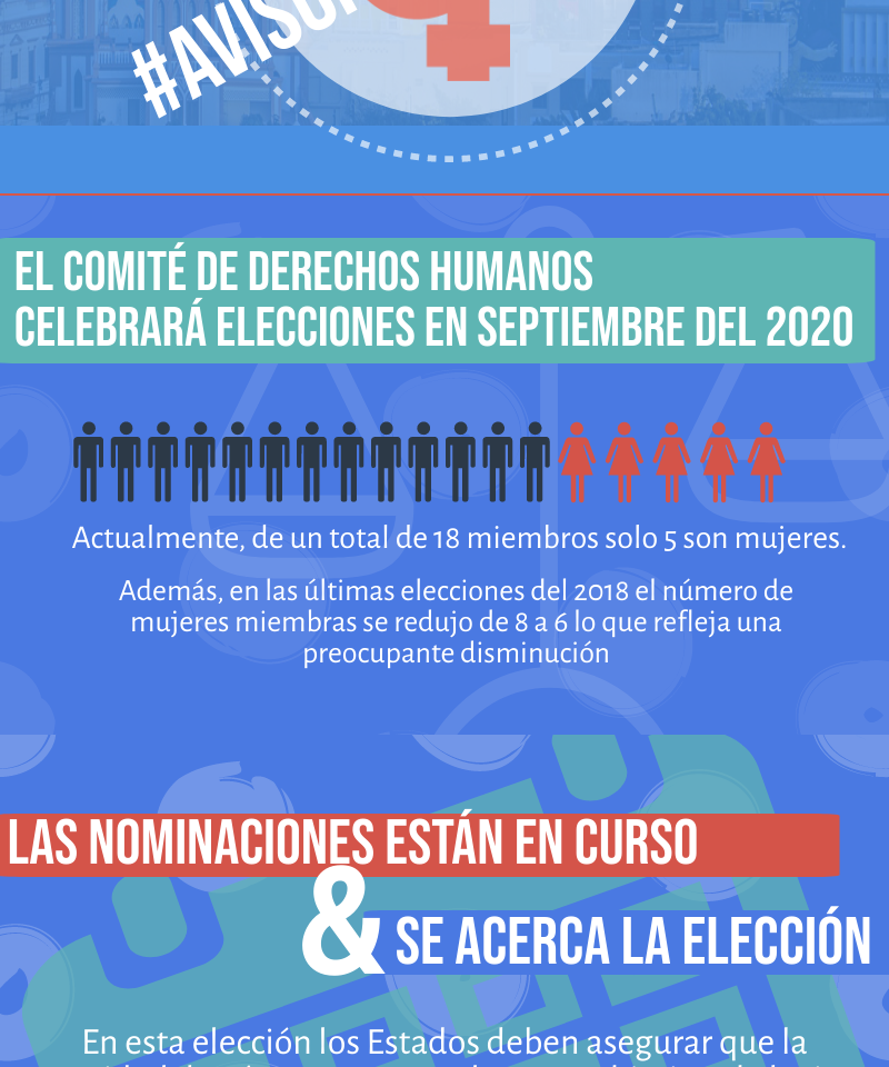 En septiembre del 2020, tendrá lugar la 38° Reunión de los Estados Partes del Pacto Internacional de Derechos Civiles y Políticos (PIDCP) en donde se elegirán nueve expertos/as para el Comité de Derechos Humanos. La composición actual del Comité es preocupante dado que refleja la subrepresentación de mujeres entre sus miembros. Así, de un total de 18 expertos/as, solo 5 (27.77%) son mujeres. Además, durante las últimas elecciones en el 2018, el número de mujeres se redujo de 8 a 6 lo que refleja una preocupante disminución.
